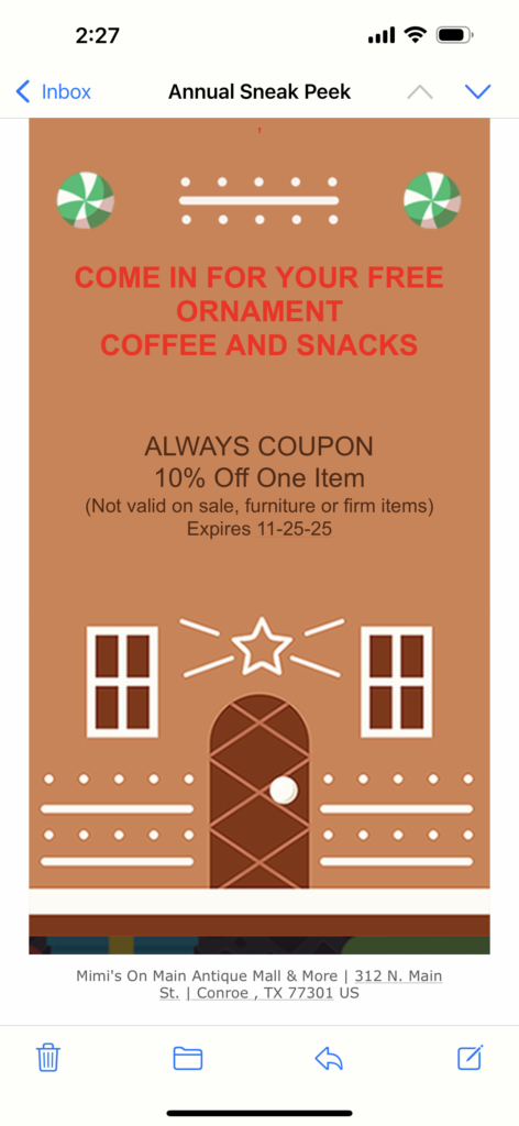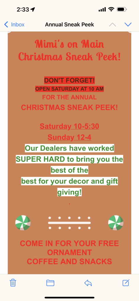 Christmas Sneak Peek November 15, 2025 Mimis Main Leave a comment Christmas sneak peek going on now at Mimi’s on Main