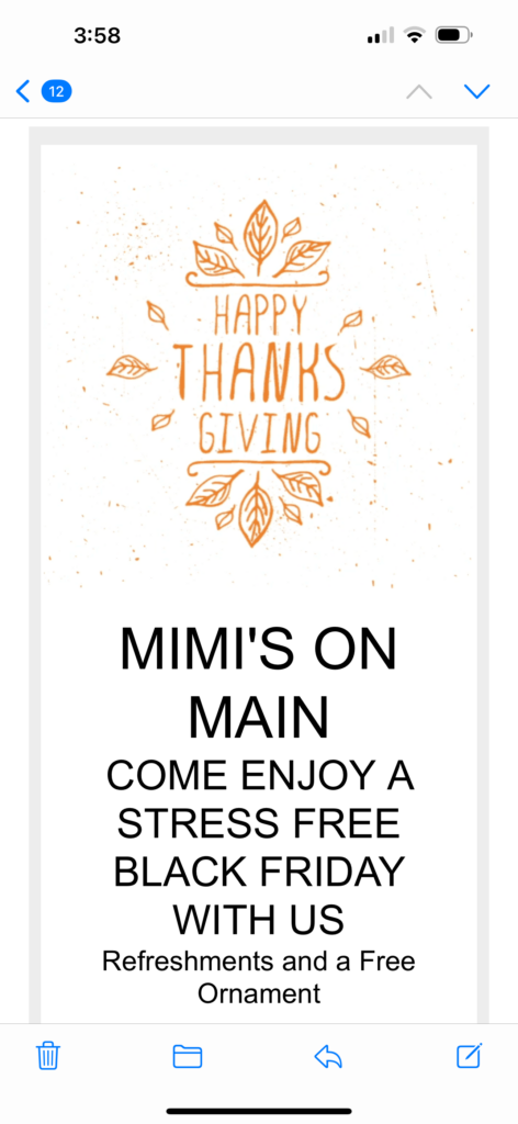 Happy Thanksgiving November 26, 2025 Sharlotte Mimi Leave a comment Mimi’s on Main will be closed Thursday, November 27, to celebrate Thanksgiving with family and friends.
