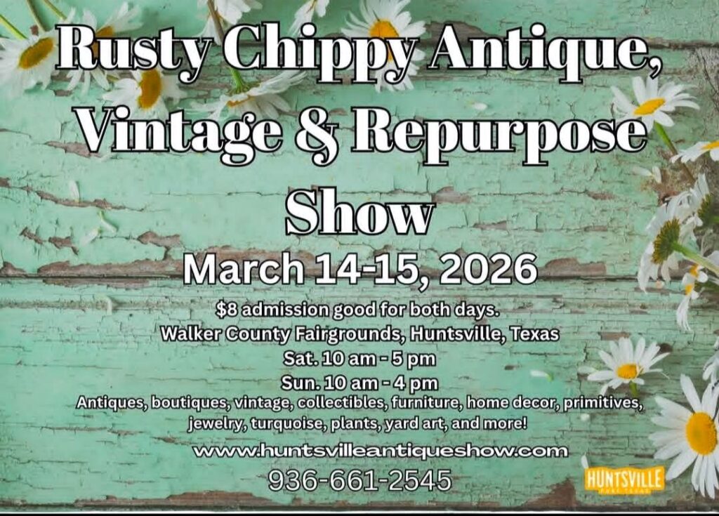 Mimi’s on Main will be participating in the Rusty, Chippy, Antique, Vintage and Repurpose Show in Huntsville, TX on March 14-15, 2026. Stop by and say hello. We would love to meet you.