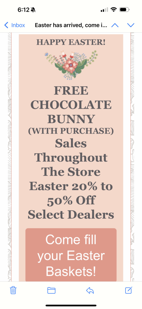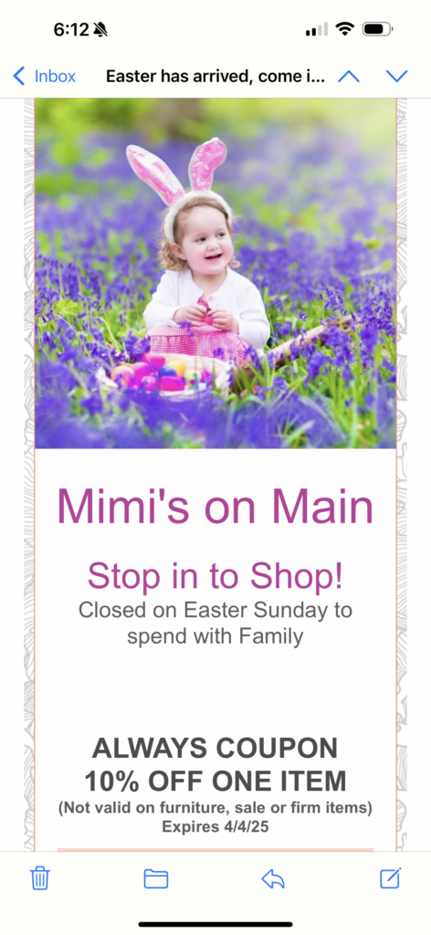 Happy Easter from Mimi’s on Main. Sales throughout the store. 20% to 50% Off from selected dealers. Free Russell Stover chocolate Bunny with purchase.
